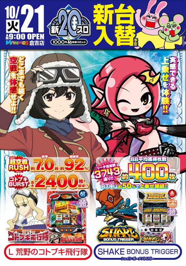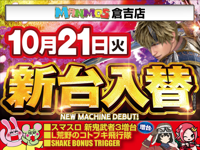 2025.10.13 新台入替 【倉吉店】新台入替!(10/21・火) 倉吉店 10/21(火) 朝9時オープン予定! 新台入替 ■スマスロ新鬼武者最速増台! ■L荒野のコトブキ飛行隊 ■SHAKE BONUS TRIGGER その他機種も同時入替! 詳しくはコチラ↓ 一覧に戻る