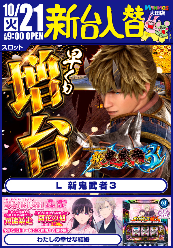 2025.10.14 新台入替 【大田店】新台入替!!(10/21・火) 大田店 10月21日(火)朝9時オープン ▼▽増台機種はこちら!▼▽ 「スマスロ鬼武者3」 ▼▽その他 新台はこちら!!▼▽ 「わたしの幸せな結婚」 「スマートぱちんこ ソードアート・オンライン」 ▼▽最新入替情報お見逃しなく!!▼▽ 詳しくはコチラ↓ 一覧に戻る