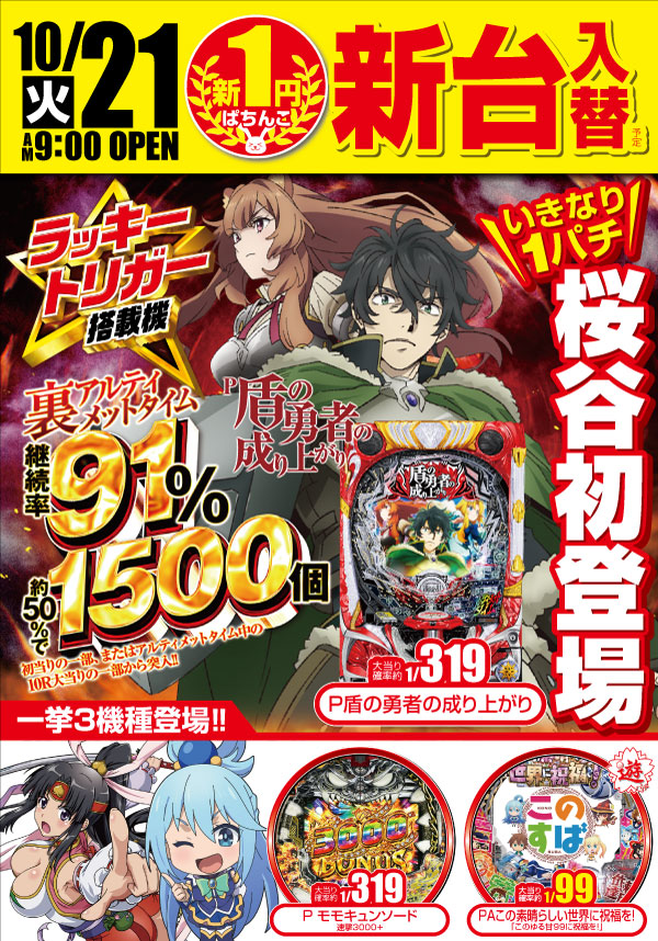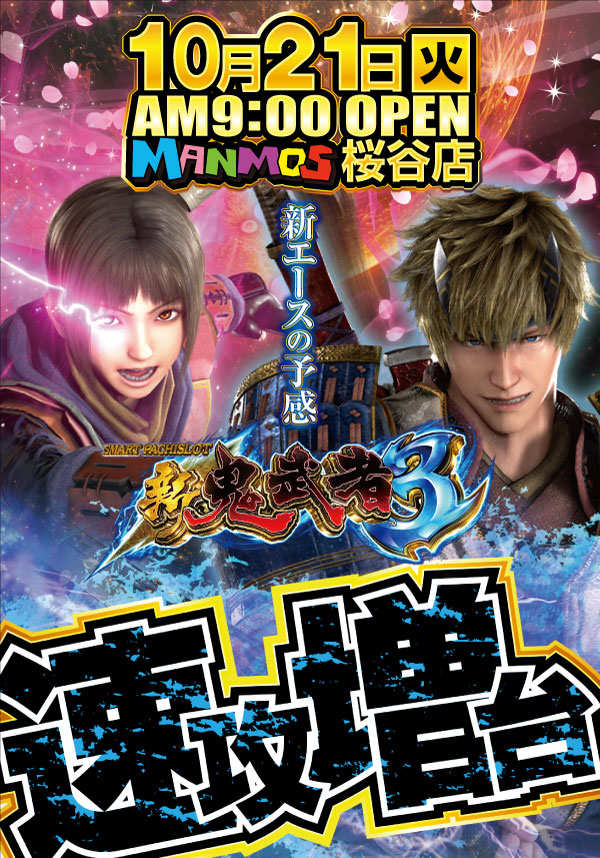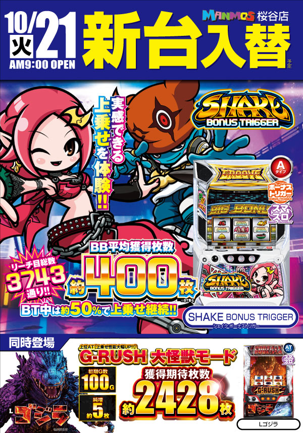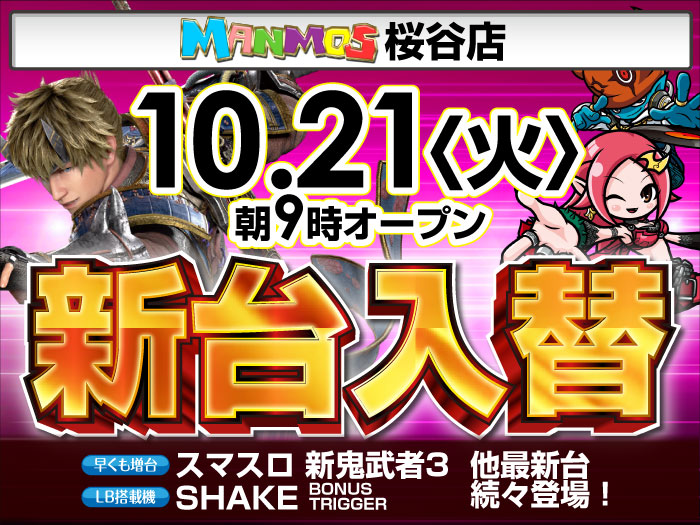 2025.10.15 新台入替 【桜谷店】新台入替!(10/21・火) 桜谷店 10/21(火)朝9時オープン! 「スマスロ 新鬼武者3」が早くも増台! 同時にボーナストリガー最新台 「SHAKE BONUS TRIGGER」が登場! 最新話題機を見逃すな!新台はマンモス桜谷店へ! 詳しくはコチラ↓ 一覧に戻る