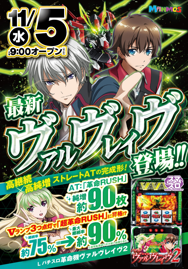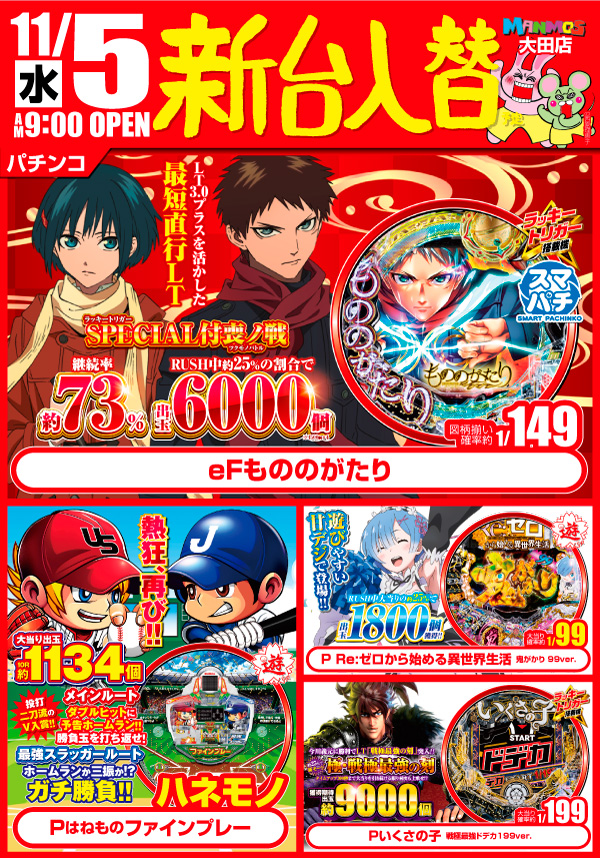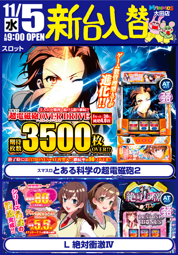 2025.10.28 新台入替 【大田店】新台入替!!(11/5・水) 大田店 11月5日(水)朝9時オープン ▼▽最新機種はこちら!▼▽ 「Lパチスロ 革命機ヴァルヴレイヴ2」 「スマスロ とある科学の超電磁砲2」 「eFもののがたり」 ▼▽その他新台もお見逃しなく!!▼▽ 詳しくはコチラ↓ 一覧に戻る