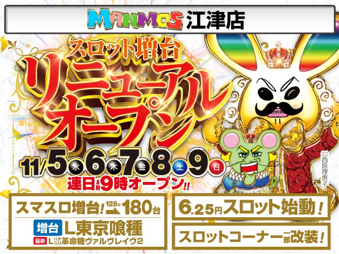 2025.11.01 新台入替 【江津店】リニューアルオープン!(11/5・水) 江津店 11月5日(水)朝9時オープン リニューアルオープン!! スマスロ増台!! 6.25円スロット始動!! スロットコーナー一部改装!! 話題の新台が続々登場♪ 最新情報をお見逃しなく!! パチンコ・スロット打つならマンモス江津店へ! 詳しくはコチラ↓ 一覧に戻る