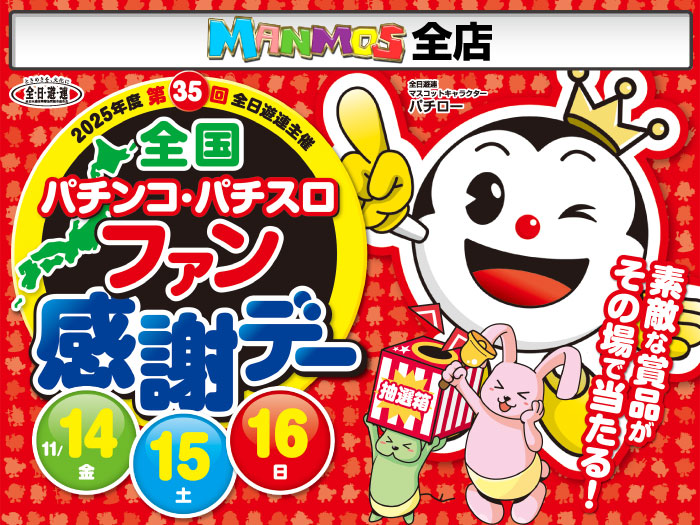 2025.11.07 お知らせ 【全店】ファン感謝デー開催!(11/14・金~) 全店開催 11月14日(金)~16日(日) 全日遊連主催 第35回 全国パチンコ・パチスロ 「ファン感謝デー」開催!! 期間中、クジを引いて当たりが出ればその場で素敵な賞品がもらえる! ※抽選時間・賞品(コース)について詳細情報はご来店頂きご確認ください。 最新情報はコチラから↓ 一覧に戻る