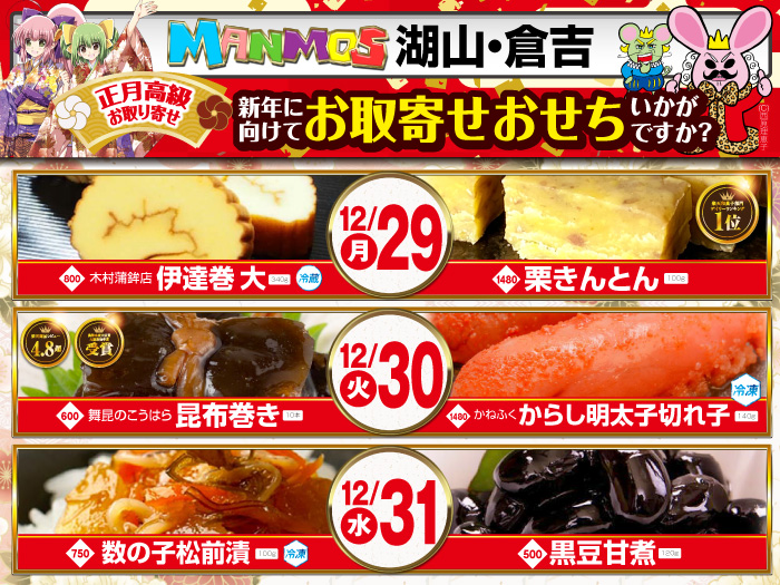 2025.12.26 絶品お取寄せ 【湖山店・倉吉店】正月高級お取り寄せ(12/29月~31水) 湖山店・倉吉店 12月29日(月)~31日(水) 新年に向けて お取り寄せおせち いかがですか? 詳しくはコチラ↓ 一覧に戻る