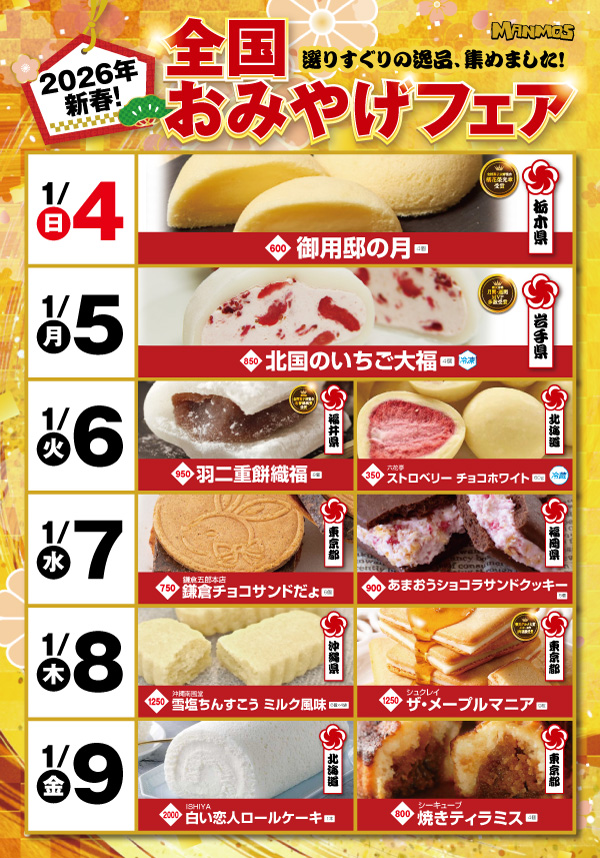 2026.01.01 絶品お取寄せ 【鳥取店舗】全国おみやげフェア(1/4日~9金) 湖山店・桜谷店・倉吉店 1月4日(日)~9日(金) 選りすぐりの逸品、 集めました! 2026年新春! 「全国おみやげフェア」 開催! ※上記スケジュールは湖山店・倉吉店のものになります。 ※桜谷店は日程と商品が異なります。詳しくは店舗にてご確認ください。 詳しくはコチラ↓ 一覧に戻る