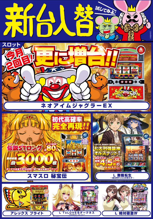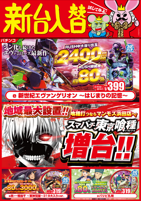 2025.12.13 新台入替 【浜田店】新台入替!(12/24・水) 浜田店 12月24日(水)朝9時オープン 浜田店新台入替 スマパチエヴァ登場! さらに ネオアイムジャグラー スマパチ東京喰種 2機種同時増台! 詳しくはコチラ↓ 一覧に戻る