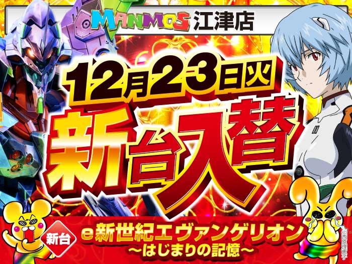 2025.12.16 新台入替 【江津店】新台入替!(12/23・火) 江津店 12月23日(火)朝9時オープン ▼▽エヴァシリーズ最新作登場!!▽▼ 「e新世紀エヴァンゲリオン~はじまりの記憶~」 ▼▽その他注目新台!!▼▽ 「スマスロ 秘宝伝」 他新台多数登場! 詳しくはコチラ↓ 一覧に戻る