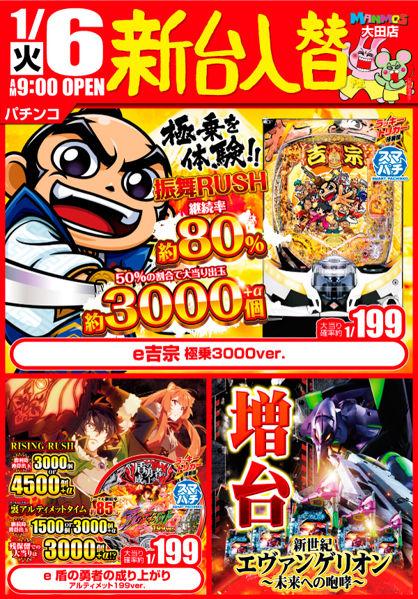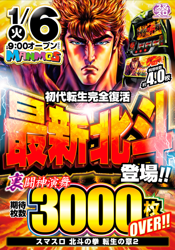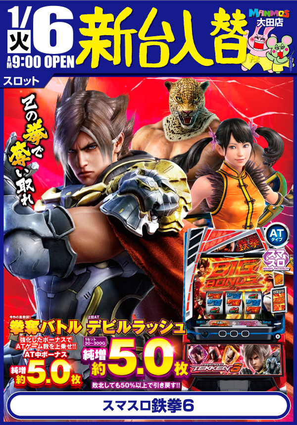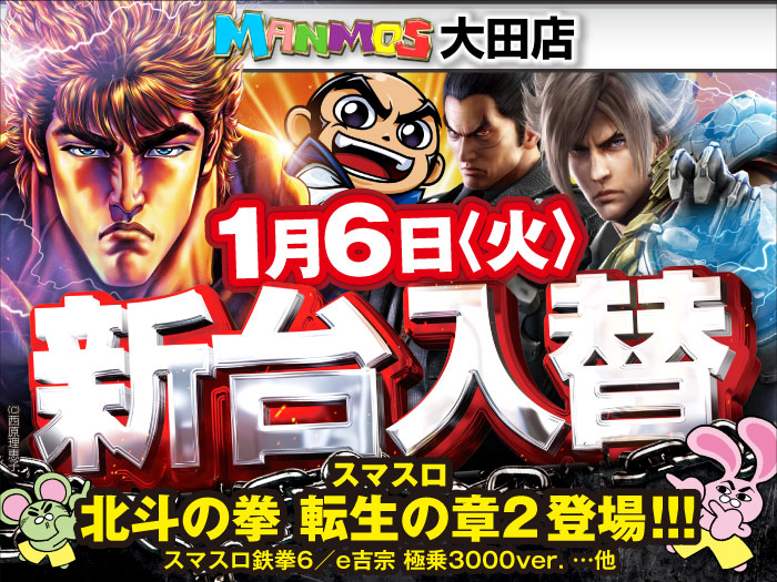 2025.12.27 新台入替 【大田店】新台入替!!(1/6・火) 大田店 1月6日(火)朝9時オープン ▼▽注目の新台はこちら!!▼▽ 「スマスロ 北斗の拳 転生の章2」登場!! 「スマスロ鉄拳6」登場!! 「e吉宗 極乗3000ver.」登場!! ▼▽その他新台もお見逃しなく!!▼▽ 詳しくはコチラ↓ 一覧に戻る