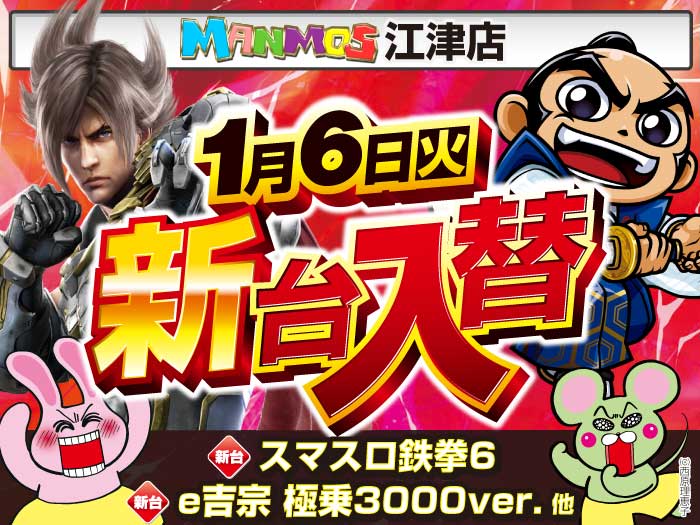 2025.12.27 新台入替 【江津店】新台入替!(1/6・火) 江津店 1月6日(火)朝9時オープン ▼▽新年最初の注目新台!!▽▼ 「スマスロ鉄拳6」 「e吉宗 極乗3000ver.」 他パチ・スロ新台多数登場! 詳しくはコチラ↓ 一覧に戻る
