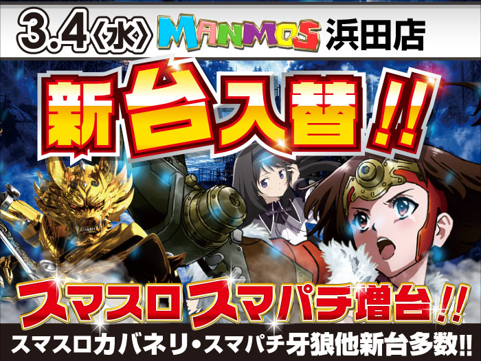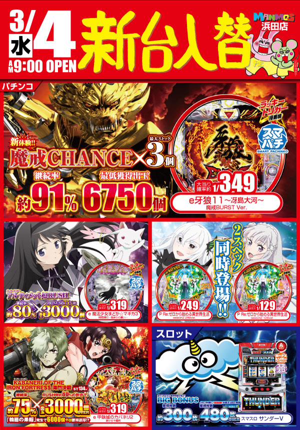 2026.02.21 新台入替 【浜田店】新台入替!(3/4・水) 浜田店 3月4日(水)朝9時オープン 浜田店新台入替 スマスロカバネリ最新作 登場‼ スマパチ牙狼も!まどかも! スマパチ・スマスロ―コーナー拡大 詳しくはコチラ↓ 一覧に戻る