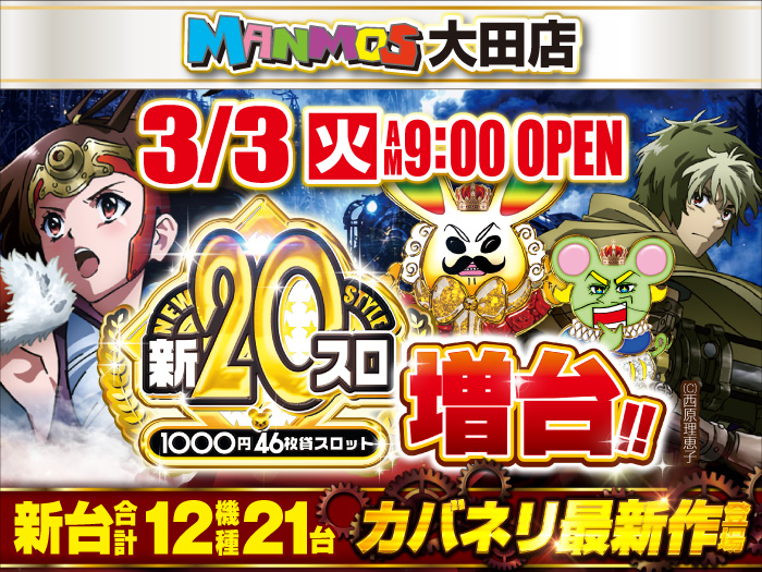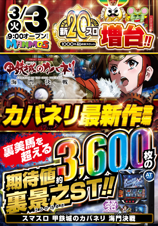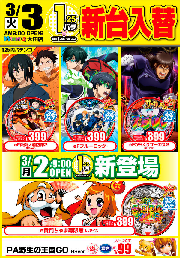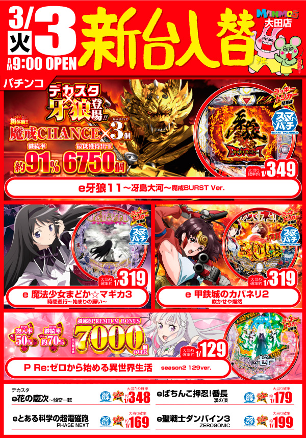 2026.03.02 新台入替 【大田店】新台入替!!(3/3・火) 大田店 3月3日(火)朝9時オープン 新20円スロット増台!! スマパチ新台も多数登場!! ▼▽注目のスマスロ新台!!▼▽ 「スマスロ 甲鉄城のカバネリ 海門(うなと)決戦」登場!! ▼▽スマパチ新台!!▼▽ 「e牙狼11~冴島大河~魔戒BURST Ver.」 「e 魔法少女まどか☆マギカ3 時間遡行~始まりの願い~」他 ▼▽その他機種もお見逃しなく!!▼▽ 詳しくはコチラ↓ 一覧に戻る